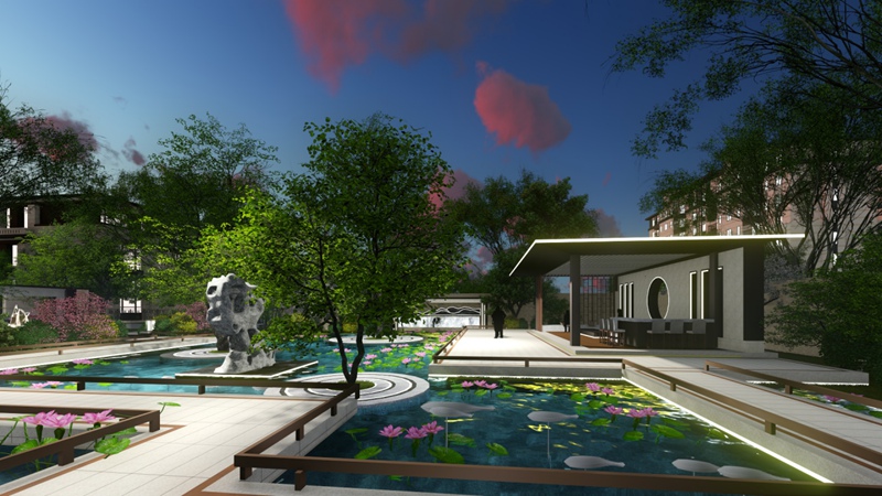 禮儀景觀大道位于園區(qū)景觀主軸線,穿過入戶大堂,首先是“江山影壁”利用框景造園手法,將植株、山石利用景門框成一幅自然山水畫,同時(shí)也起到了很好的分流作用;繞過“江山”至園內(nèi)重點(diǎn)的景觀區(qū)“一池山?!保饘倬W(wǎng)造型山脈與潺潺流水、燈光的完美融合,呈現(xiàn)出一幅立體畫卷;向南沿伸為翰墨閣,用作戶外等候區(qū),也是一個(gè)景觀駐足點(diǎn);依次向南分別是利用LED燈和碎石子鋪成水流漣漪狀的“樹影流徑”和造型雕塑“丹青魅影”;最后是書香十六景中的第六景“荷塘漣漪”,位于景觀中心地帶,貫穿南北區(qū),此處荷花塘設(shè)計(jì)為冬夏兩用,即夏日蓄水為荷花塘,冬日抽干水作兒童游樂廣場(chǎng)。中心縱向景觀層次分明,水景豐富,應(yīng)用LED、金屬小品等現(xiàn)代元素并搭配綠植小品,使得四季皆有景可賞。
