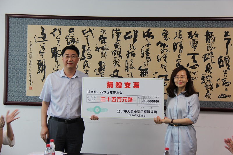 捐贈(zèng)儀式上,中天集團(tuán)向西市區(qū)慈善總會(huì)捐款35萬(wàn)元,用于西市區(qū)教育事業(yè),體現(xiàn)了中天集團(tuán)心系教育的高尚情懷和強(qiáng)烈的社會(huì)責(zé)任感,是對(duì)西市區(qū)教育事業(yè)莫大的關(guān)心、支持和鼓舞?,F(xiàn)場(chǎng)于洪波總裁將支票遞交給管尊旭副書記。慈善總會(huì)劉麗華會(huì)長(zhǎng)向于總頒發(fā)了捐贈(zèng)證書。