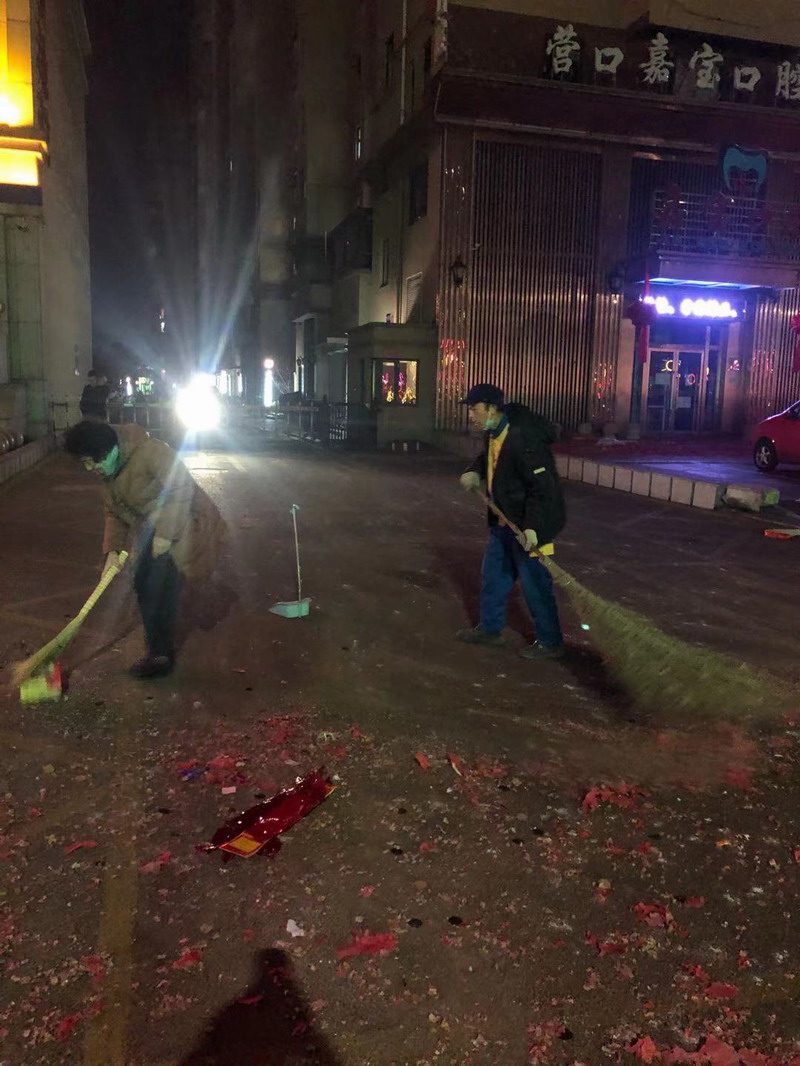 除夕夜燃放煙花爆竹是春節(jié)慶祝的方式,晚上十點,是物業(yè)人的集結(jié)令,當(dāng)大家都沉浸在過年的闔家歡樂的喜慶氛圍中,中天物業(yè)全體員工卻投入清掃的崗位中,是他們將轄區(qū)燃放的爆竹紙屑清掃的一塵不染。凡是有鞭炮紙屑的地方就有我們物業(yè)人的身影,微笑著穿梭在轄區(qū)的各個角落,他們彎身弓腰、揮掃裝袋。當(dāng)業(yè)主們初一清晨走入園區(qū)時,映入眼簾的仍然是干凈、整潔、安全的社區(qū)環(huán)境。