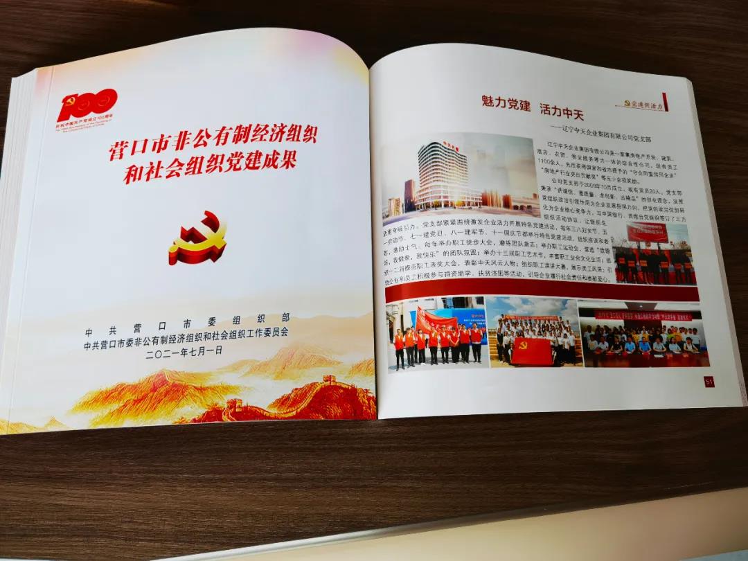 2021年6月25日,營(yíng)口市委組織部及營(yíng)口市委非公有制經(jīng)濟(jì)組織和社會(huì)組織工作委員會(huì)在營(yíng)口文化藝術(shù)中心舉行黨建成果發(fā)布會(huì),并對(duì)黨建取得優(yōu)異成績(jī)的單位進(jìn)行隆重表彰。中天企業(yè)集團(tuán)黨支部獲得黨建促活力成果獎(jiǎng),大會(huì)現(xiàn)場(chǎng)進(jìn)行成果發(fā)布,受到營(yíng)口市委的表獎(jiǎng)。