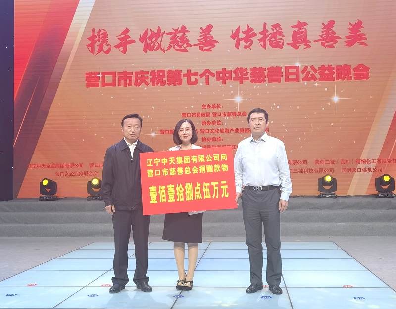 2022年9月27日,營口市慈善總會在營口新聞傳媒中心壹號演播大廳舉辦第七個“中華慈善日”晚會。晚會現(xiàn)場,總裁于洪波代表中天集團向營口慈善總會捐款捐物118.5萬元。