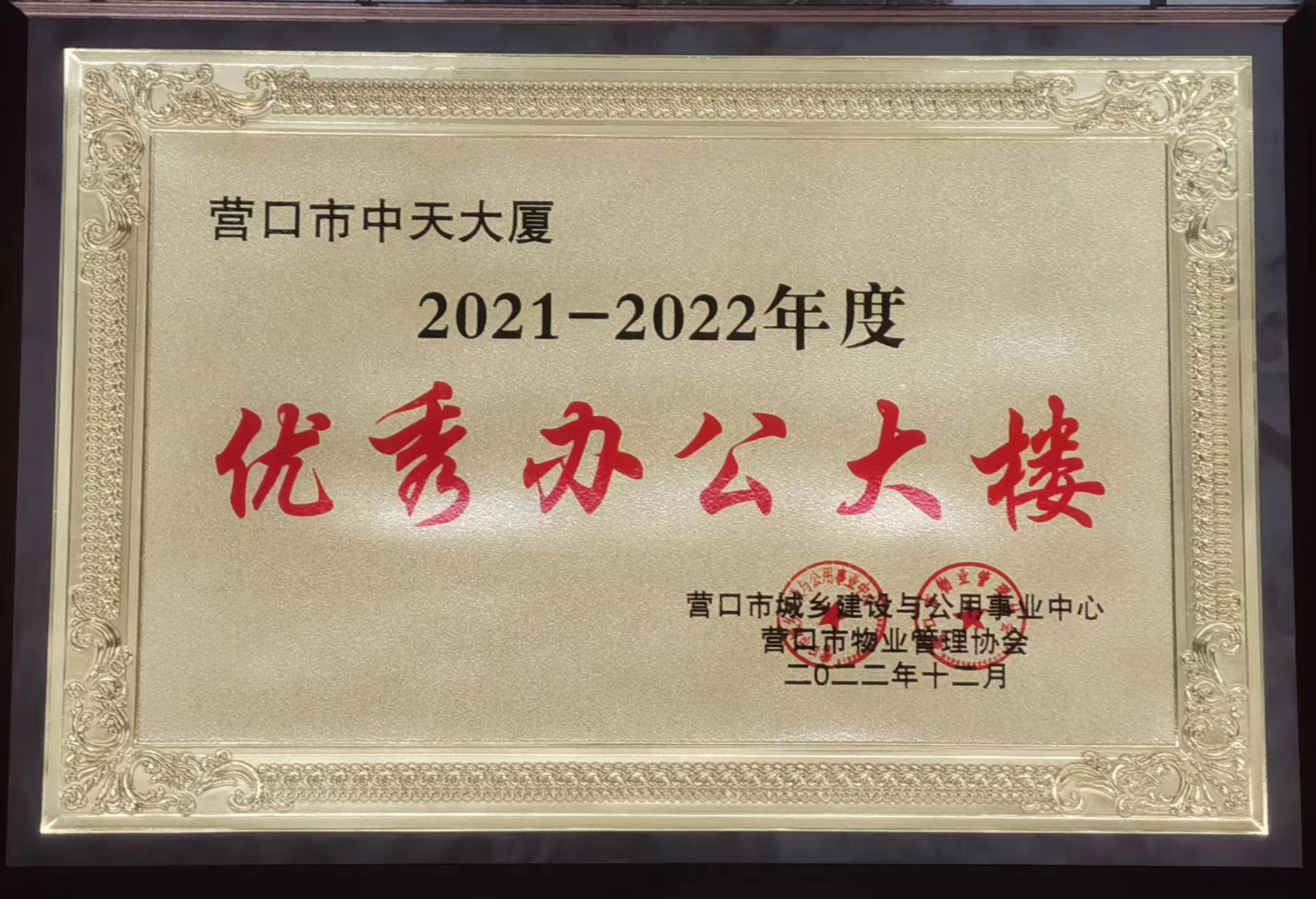 3月9日下午,營(yíng)口市城鄉(xiāng)建設(shè)與公用事業(yè)中心和營(yíng)口市物業(yè)管理協(xié)會(huì),在財(cái)富酒店召開(kāi)“2021-2022年度營(yíng)口市優(yōu)秀物業(yè)服務(wù)項(xiàng)目、優(yōu)秀服務(wù)人員評(píng)選活動(dòng)”頒獎(jiǎng)典禮。中天大廈在全市各機(jī)關(guān)企事業(yè)辦公大樓中,與其它17家單位共同獲得“優(yōu)秀辦公大樓”稱(chēng)號(hào),項(xiàng)目經(jīng)理趙瑩代表上臺(tái)領(lǐng)獎(jiǎng)。
