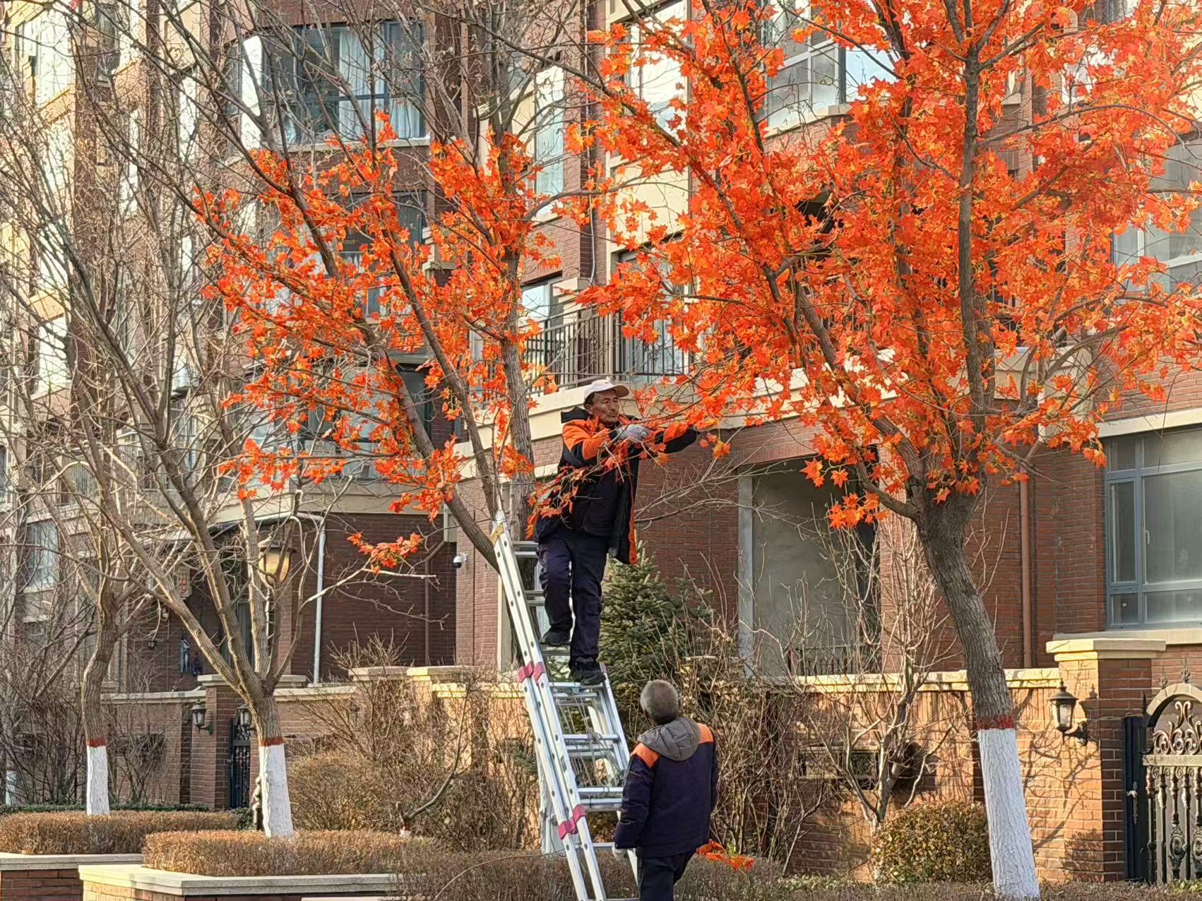 物業(yè)工作人員化身“冬日魔法師”,借助梯子登上枝頭,將鮮亮的人造楓葉精心懸掛。原本在寒風中略顯蕭索的園區(qū),因這抹抹火紅,瞬間暖意融融?;鸺t葉片在枝頭輕輕搖曳,與小區(qū)英倫風格建筑相互映襯,仿佛把秋日的絢爛“定格”,打破了季節(jié)的單調(diào),讓寒冬有了別樣生機。